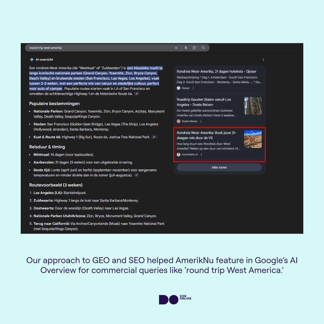 AmerikaNu is een Nederlandse reisorganisatie die zeer persoonlijke rondreizen door de Verenigde Staten samenstelt, gebaseerd op tientallen jaren praktijkervaring en diepgaande lokale kennis. Hoewel het aanbod van hoge kwaliteit was, sloot de online zichtbaarheid daar niet op aan. Om de sterke merkautoriteit om te zetten in commerciële groei werkte AmerikaNu samen met Dok Online aan een toekomstbestendige SEO-strategie. Samen ontwikkelden we een contentframework dat is gericht op het aantrekken van zoekverkeer met hoge intentie en het omzetten daarvan in daadwerkelijke boekingen.