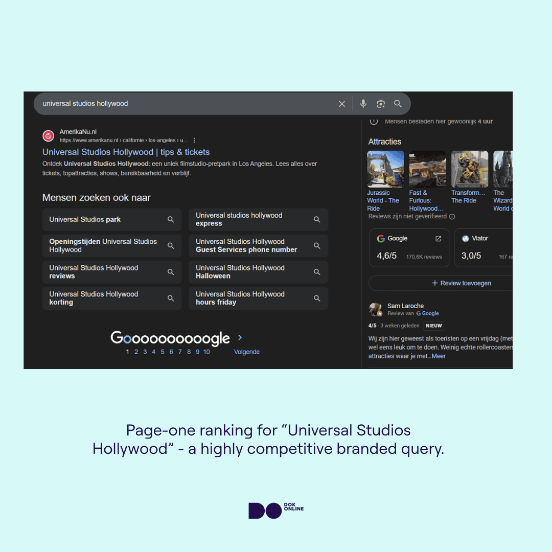 In plaats van alleen te ranken met een klein aantal productpagina’s verschijnt AmerikaNu nu in elke fase van de oriëntatiereis. Van brede ontdekkingszoektermen (“rondreis West-Amerika”) tot besluitvormingsvragen (“beste reistijd New York”) en lokale ervaringen (“wat te doen in Utah”) hebben ze een aanwezigheid opgebouwd die aansluit op elke stap van de reizigersintentie. Deze multi-intent dekking vergrootte het aantal instappunten en versterkte hun autoriteit in de ogen van Google.