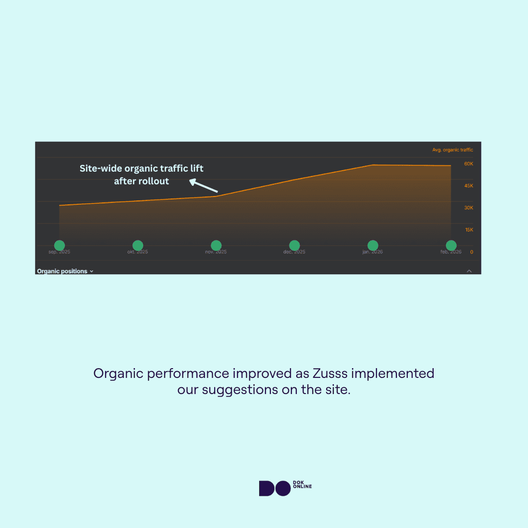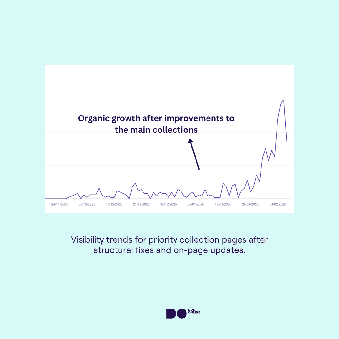 Zusss partnered with Dok Online to grow organic traffic on their Shopify store. Starting in October, we ran a focused SEO sprint: a full-site audit with a prioritized action list, followed by sitewide fixes across internal linking, breadcrumbs, and structured data. We also built a category-level topical map to guide missing collections, and supported it with collection-page copy and QA. Getting those basics right resulted in 90% growth in organic visitors in just three months.